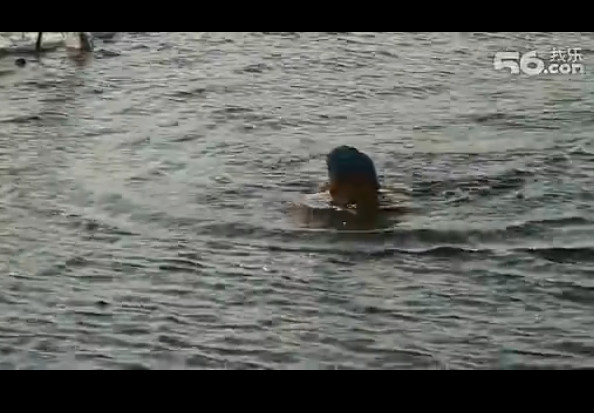 ▲大陸北方天氣寒冷,河水結冰,老人不怕冷下水游泳。(圖/取自56我樂)