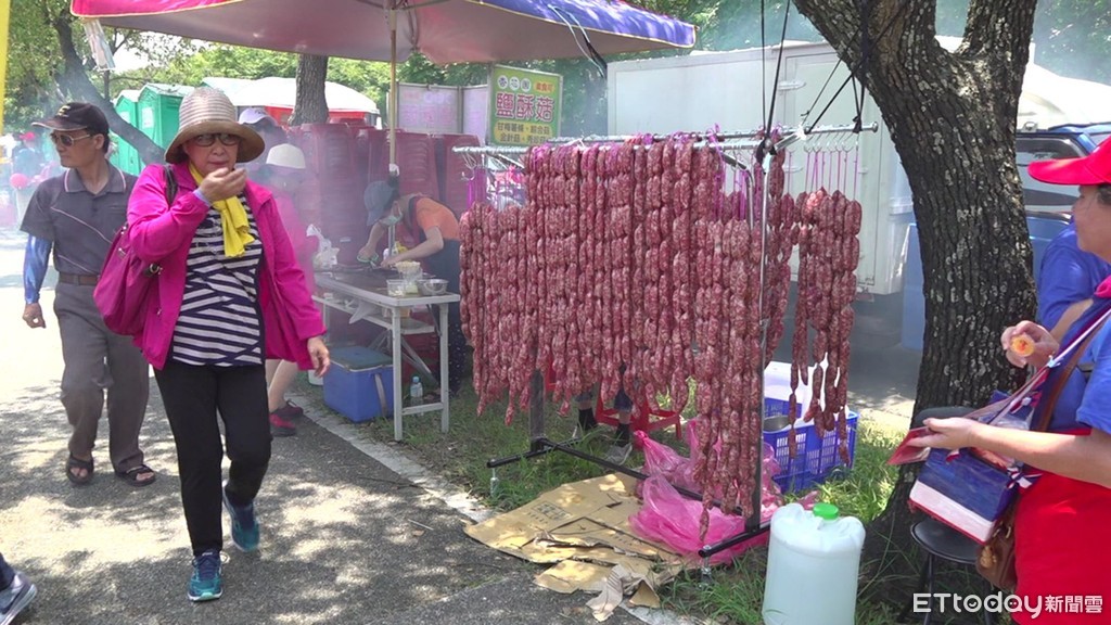 2000條香腸一字排開,壯觀的「香腸瀑布」這回重現雲林,老闆陳嘉慶笑說,上次花蓮場沒去,大家不斷反應「很想他」,這回乾脆前一晚就到雲林就位,烤香腸烤到手指關節都受傷,還是甘之如飴。另一攤同業同樣準備2000條烤香腸,結果才半天就已經賣出1000條,生意嚇嚇叫。