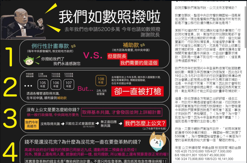 政院反擊我們高雄市說,公文沒來怎麼補助?
