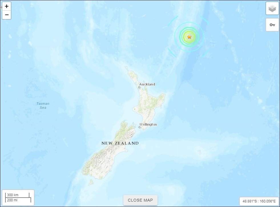 紐西蘭太平洋海域台灣時間16日早上6時54分許發生規模7.2強震。根據美國地質調查局(USGS)資料顯示,地震震央位於紐西蘭東北方約103公里處,紐西蘭與東加之間的太平洋海域,震源深度34.4公里,屬於淺層地震,太平洋海嘯預警中心立刻發布海嘯警報,距離震央300公里處的半徑圓內都有可能受到海嘯的侵襲,目前尚未傳出傷亡報告。
