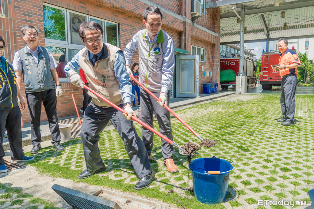 梅雨季,為防颱防淹水,台南市長黃偉哲6月17日率領台南市環保局長林淵淙、東區陳勝楠區長等人,在東區關聖里,親自拿起工具,示範如何清理附近防火巷及住家前後水溝。