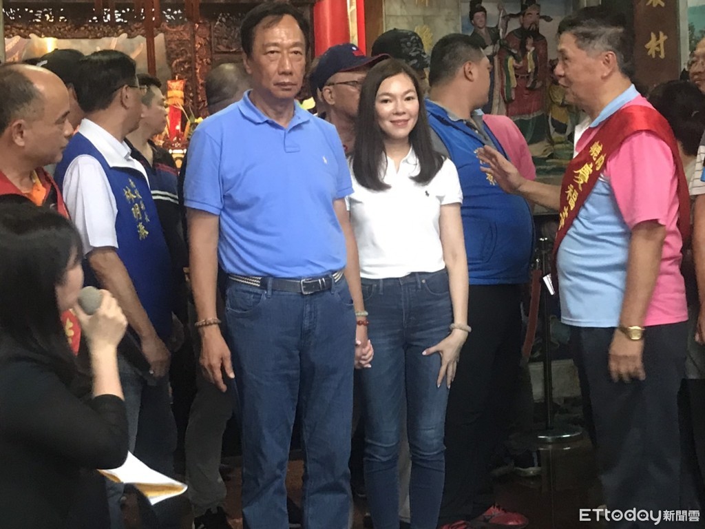 ▲總統初選參選人郭台銘17日帶著妻子曾馨瑩到南投市慶福寺參香。(圖/記者白珈陽攝)