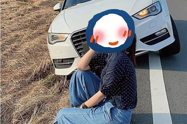 網友在《爆廢公社二館》PO出2張照片,只見她綁著馬尾坐在一台白色奧迪車前拍照,但細看發現,白色奧迪卡在路邊動彈不得,右半邊跌落田邊、左半邊則掛在路旁的白線上。