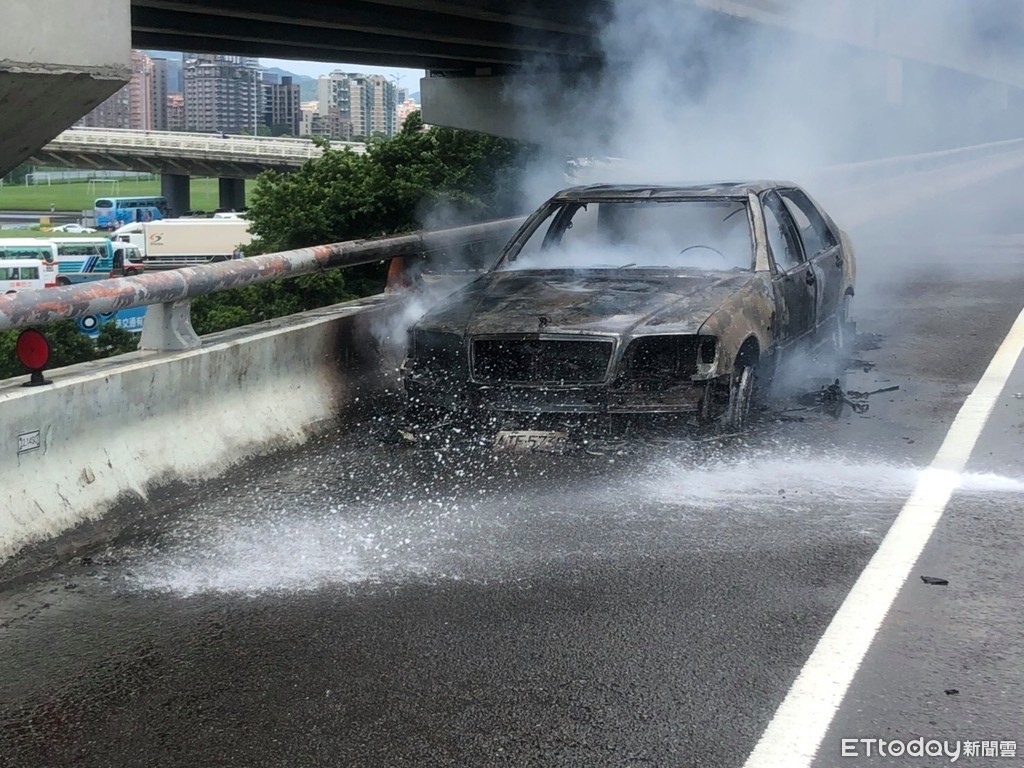 邱姓司機在FB粉絲團《國道公路警察局》留言表示,他看到前方車輛已爆胎停在內湖段,卻還是硬開上路,不久就驚見輪胎開始冒煙,沿路都是火!警消人員到場後,第一時間拉水線搶救,猛烈的水柱直往火燒車噴,火勢才得以撲滅,但車已成廢鐵。