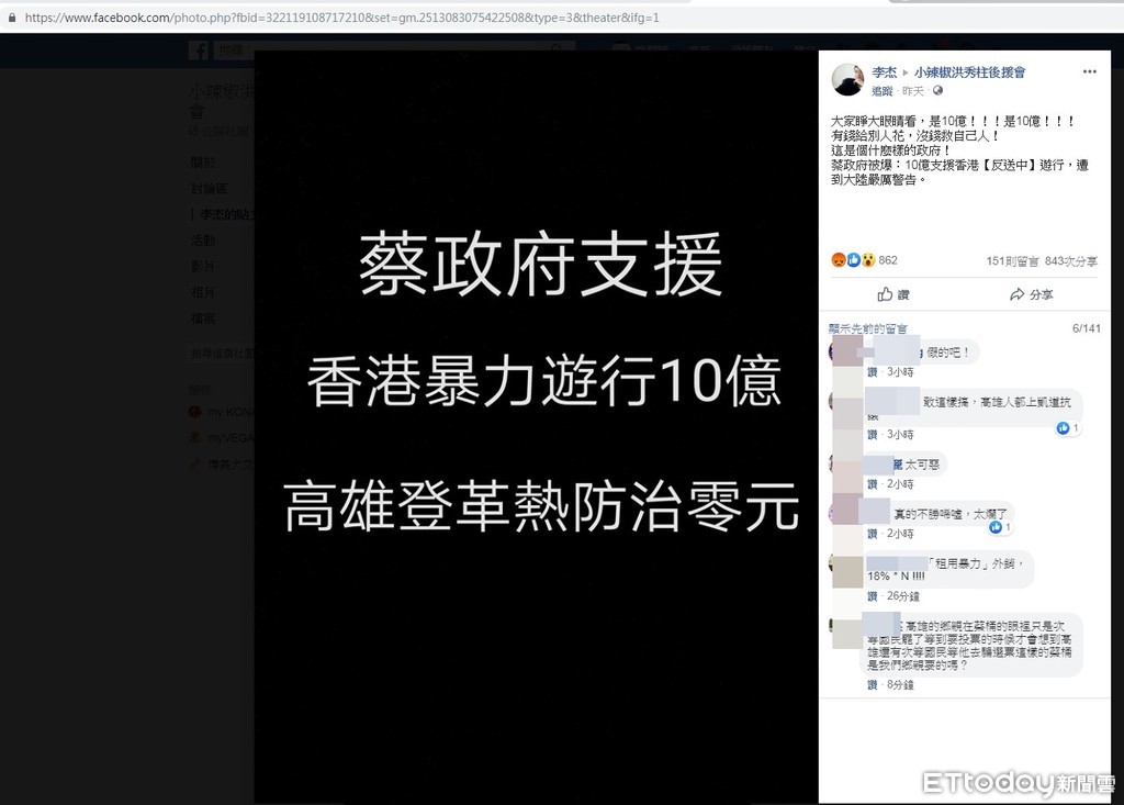 總統蔡英文震怒了!日前臉書有名自稱「李杰」網友,透過臉書帳號在各大藍營社團、粉絲專業PO文宣稱:「蔡政府支援香港暴力遊行10億,高雄登革熱防治零元」結果經民眾檢舉,總統府發言人室19日正式向刑事局偵九大隊舉發、目前警方已受理此案,並初步確認該帳號為海外新加坡註冊的人頭網軍。