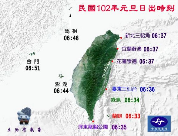 中央氣象局31日上午發布低溫特報,從跨年夜到元旦升旗,溫度只有10到12度,要等到1日白天過後,氣溫才回稍稍回升。台灣東半部雲層仍然較厚,東部的民眾想見到2013年第一道曙光,恐怕比西部難些。