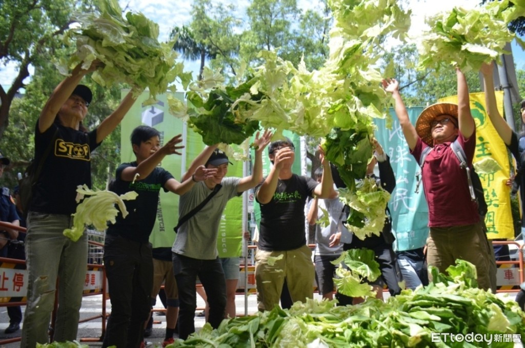 ▲民間團體灑菜渣抗議行政院版工輔法毀農滅國 。(圖/地球公民基金會提供)