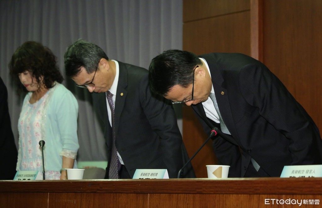 ▲長榮公司針對罷工事件召開記者會,鞠躬向罷工造成不便致歉。(圖/記者屠惠剛攝)