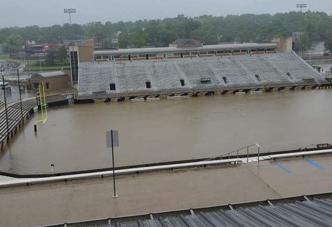 球場淹水的照片是先由校內工作人員po上臉書,照片中可以足球場已經被混濁的泥水淹沒,距離觀眾席只剩下一點點距離。西密西根大學發言人戴維斯(Paula Davis)表示,雨量太大導致校園排水系統無法及時排水,除了足球場以外,周圍的棒球場、停車場也都被淹沒,第一時間學校先將排水系統關閉,避免建築受到損害,等雨停之後已重新抽水,目前足球場已恢復原狀。