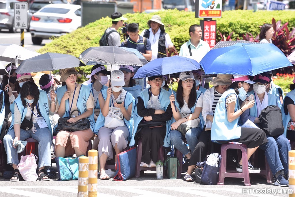 ▲現場出現一片傘海,空服員躲在陰影下爭取在烈日下喘息的空間。(圖/記者李毓康攝)