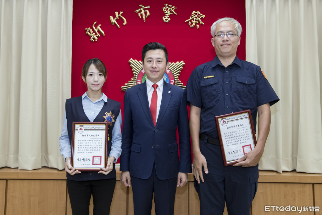 ▲新竹市警察局在治安會報中,表揚婦幼警察隊副隊長王佳琳(圖左)及第一分局警員郭有軒(圖右)。(圖/記者陳蒲芬翻攝,下同)