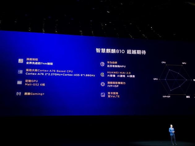 何剛介紹說,麒麟810的NPU運算跑分超過高通855和高通730,且採用2個A76大核,搭配6個A55小核的設計,主頻最高為2.27GHz,還支援麒麟Gaming+技術,以及雙卡雙VoLTE,「華為至此也成為首個擁有麒麟980和麒麟810這兩顆7nm晶片的手機廠商。」