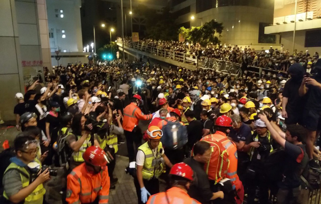 「反送中」示威者昨日包圍警察總部、灣仔警署、稅務大樓和入境事務大樓,並且做出淋油、雷射照射、丟雞蛋等激動行為,抗議過程中有9女4男身體不適,其中包括懷孕女警及年長者。由於上萬名「反送中」市民用鐵馬及雜物圍堵警察總部出入口,以至於附近道路阻塞,而13名員工也因此受困約13小時才被送至醫院。