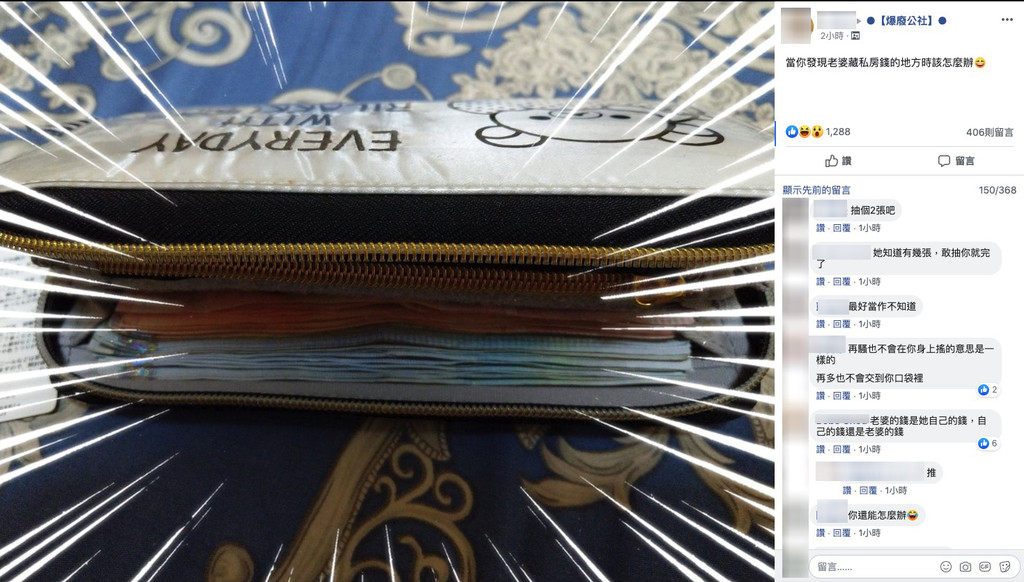 「當你發現老婆藏私房錢的地方時該怎麼辦?」一位人夫在臉書私密社團《爆廢公社》這樣發文,眾多網友趕緊勸告人夫,想活命就快點放回去。