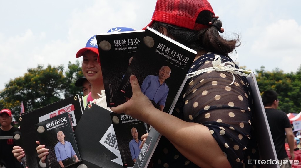 韓粉齊聚台中大會師,其實在現場裡頭販賣的挺韓周邊商品,還真的是琳瑯滿目,從衣服、帽子、毛巾等等,可以說是「什麼都有,什麼都不奇怪」,幾乎什麼都會有韓粉買單,但是《ETtoday新聞雲》記者就直擊,有人賣黃光芹替韓國瑜寫的書《跟著月亮走》,一擺攤就被韓粉用台語嗆:「這個..不要買」。