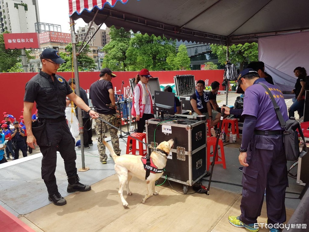 只見3隻訓練有素的偵爆犬在領犬員帶領下,在造勢現場不斷嗅聞,不僅登上舞台檢查各項器材、道具,就連舞台底下也不放過,逐一檢查是否出現異樣,確保這一場造勢活動能平安落幕。