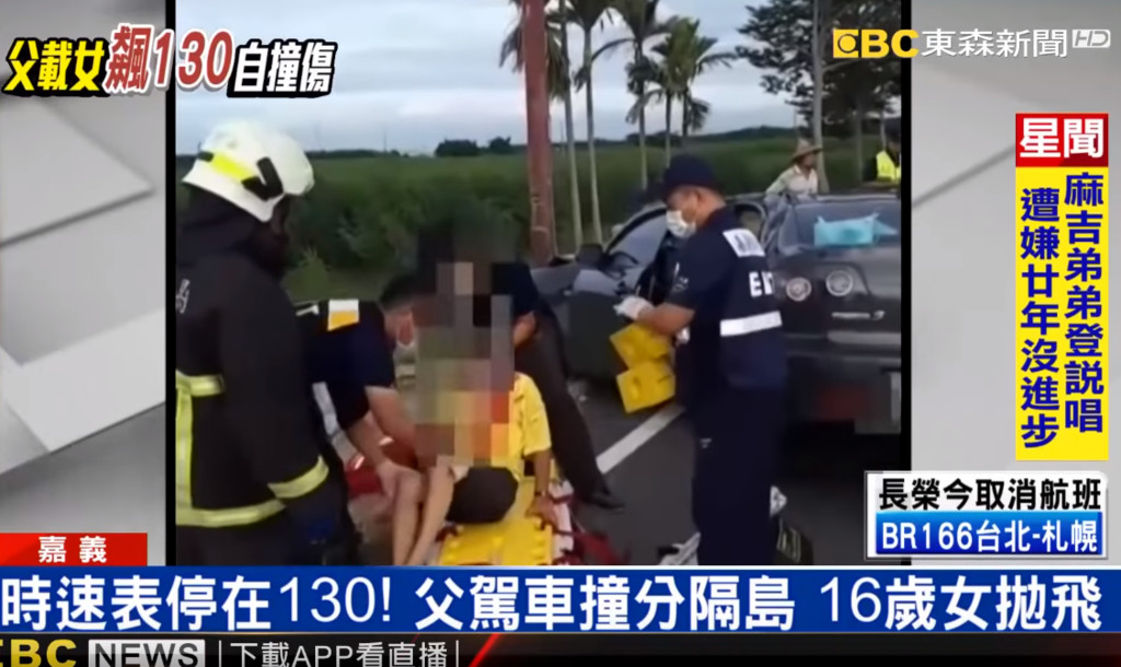 嘉義縣東石鄉一對父女發生嚴重車禍,一名60歲陳姓男子行經港口大橋橋頭處時高速撞上分隔島,導致車體撕裂,16歲的女兒也因強大的撞擊噴飛車外。警方表示,車內的車速表指針停在時速130公里,詳細肇事原因還有待釐清。