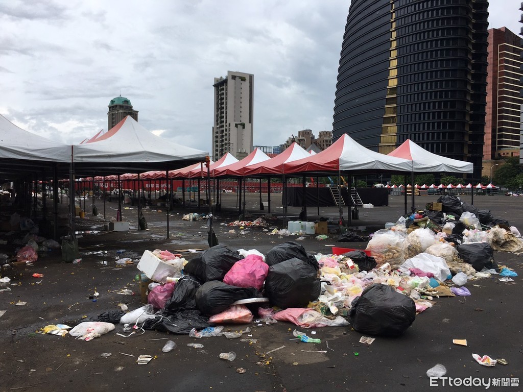 韓國瑜造勢晚會順利落幕,激情過後,一大早就發現場地全是垃圾,尤其是攤位帳棚內最為嚴重,人潮太多,也外溢到隔壁遺址公園,連帶的垃圾也污染了原本乾淨草地,負責養護遺址公園的廠商表示,雖然公園本該是合約內工作,但垃圾量確實是平時上百倍,因為參觀民眾根本不會留下垃圾。