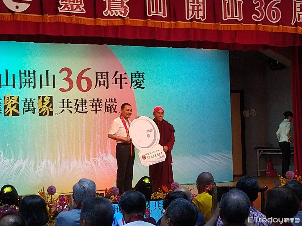 ▲ 靈鷲山開山36周年捐500住警器,侯友宜贈「普利十方」匾額。(圖/新北市民政局提供,下同)