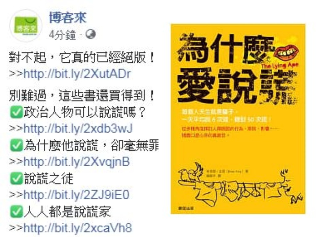 也有不少人開始尋找這本書是否還有販售?然而博客來的網站卻只寫著「已絕版,無法銷售」。隨後,博客來在FB上表示,「對不起,它真的已經絕版!!」不過還推薦了其他「說謊」系列的書籍,包括:《政治人物可以說謊嗎?》、《為什麼他說謊,卻毫無罪惡感》、《說謊之徒》、《人人都是說謊家》。
