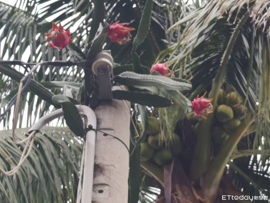 ▲高高的電線桿上長出火龍果。(圖/記者唐詠絮攝,以下同)