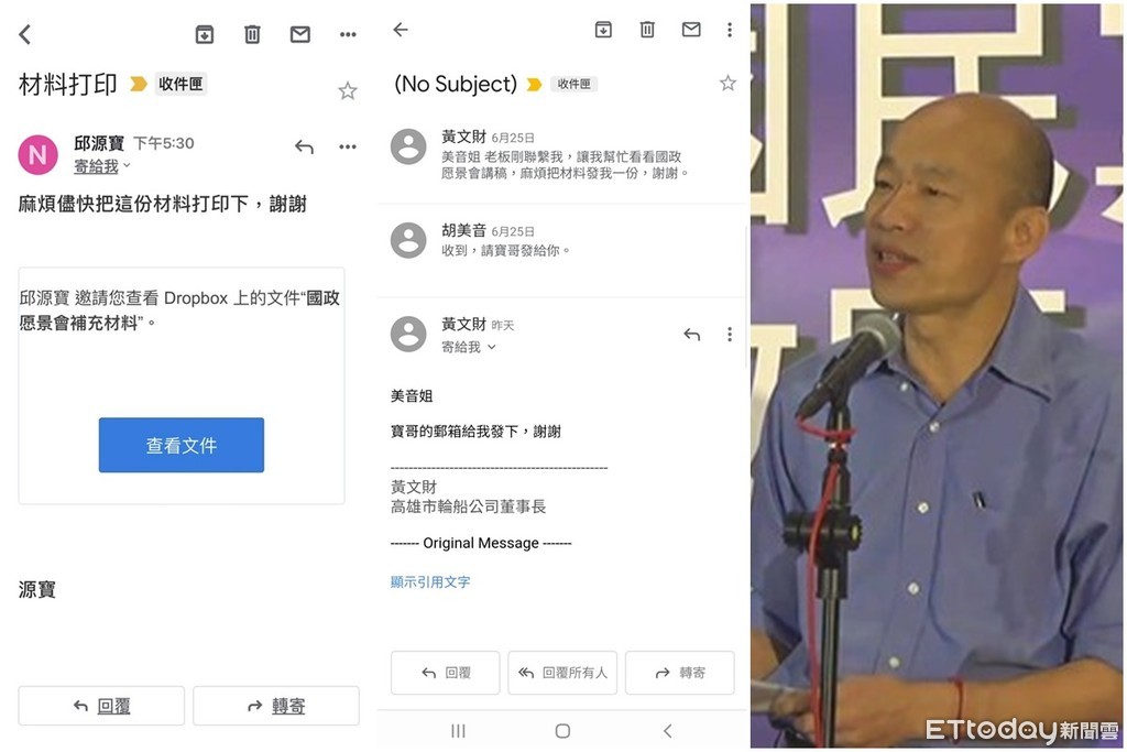 對此,高雄市長室副主任胡美音表示,26日上午9點57分左右,她的gmail收到一封信,署名「高雄市輪船公司董事長黃文財」,內容寫到:「美音姐,老板剛聯繫我,請我幫忙看看國政願景會講稿,麻煩把材料發我一份,謝謝。」