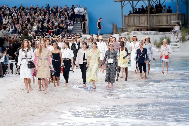 怎麼樣買到當季的精髓?這一定得做功課才行!今年 Chanel 春夏將波光粼粼的度假海岸搬到大皇宮裡,所有的模特兒都脫下跟鞋,赤腳放的走在岸邊,而本季如果要挑單品的話請從特殊材質及色系下手,Chanel 將度假海洋的意象融入單品設計中,在色系是上以粉嫩大地色彩為主,並加入大量藍色呼應海洋的元素,而海水則射出的反射,則用裝則感的質材取代,如果想在配件上挑中本季重點,那請把「粉色」及「光澤」這兩個關鍵納入其中,讓妳靠櫃挑包時可以讓店員知道妳很內行~