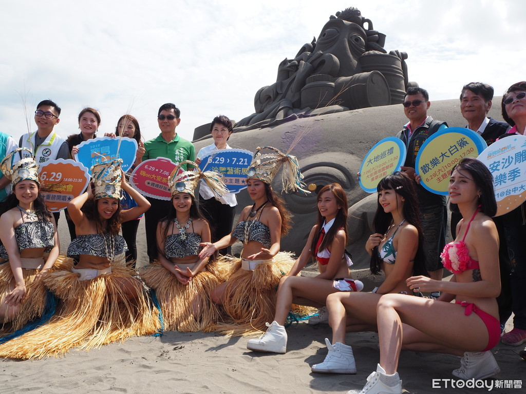 觀旅局26日下午在大安濱海樂園舉行沙雕音樂季記者會,盧秀燕、觀旅局長林筱淇、議員吳敏濟和多名里長出席,盧說,大安沙雕音樂季已邁入第9年,已成為台中亮點活動,每年都吸引2、30萬人參加,今年沙雕創作透過海陸生態、海神故事,並結合大安港的鯨魚意象為主軸,規劃18座精緻3D沙雕作品,並打造中台灣最大型「海翁」沙雕,非常精彩。