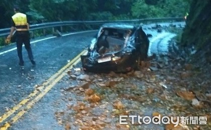 ▲南投縣仁愛鄉台14線5月16日曾發生落石,導致2台自小客車嚴重受損。(圖/民眾提供)