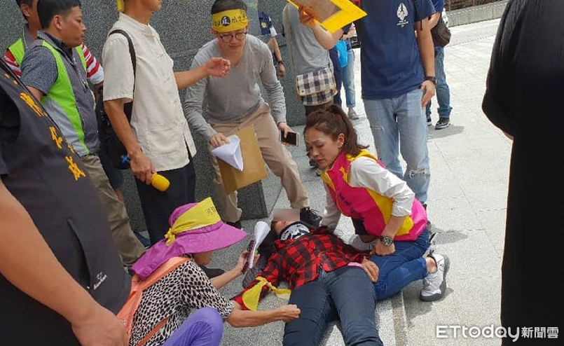 ▲抱病抗議的廖姓婦人,因術後未癒,又情緒激動,當場癱軟倒。(圖/翻攝自Facebook/我是頭份人,下同)
