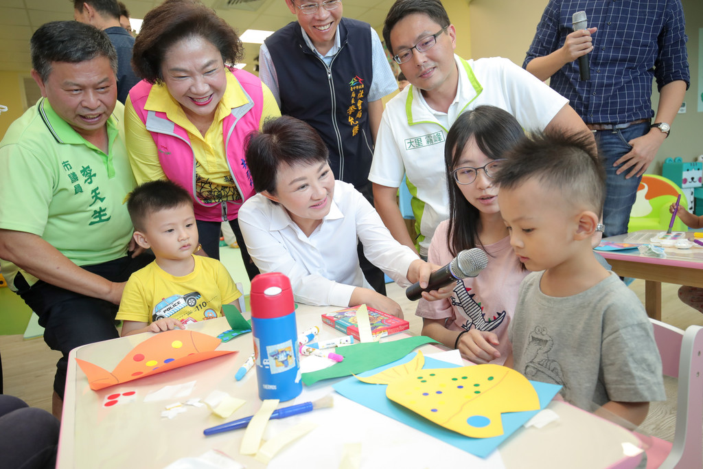 社會局今天舉行大里親子館開幕典禮,盧秀燕進入館內欣賞小朋友作品,並一同完成恐龍造型勞作,小朋友們用奶音喊著「市長媽媽」萌翻全場,氣氛溫馨歡樂,她說,身為女性市長,友善親子環境政策刻不容緩,「公幼公托倍增計畫」已逐漸實現中,預計4年內增加180班公幼、18家公托,均已陸續開工,減輕家長負擔。