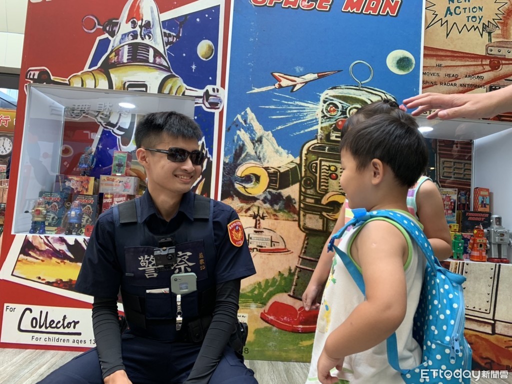 ▲台南市警一分局莊敬派出所警員蔡宇杰,在南紡購物中心,配合羅伯特機器人特展宣傳青春專案。(圖/記者林悅翻攝)