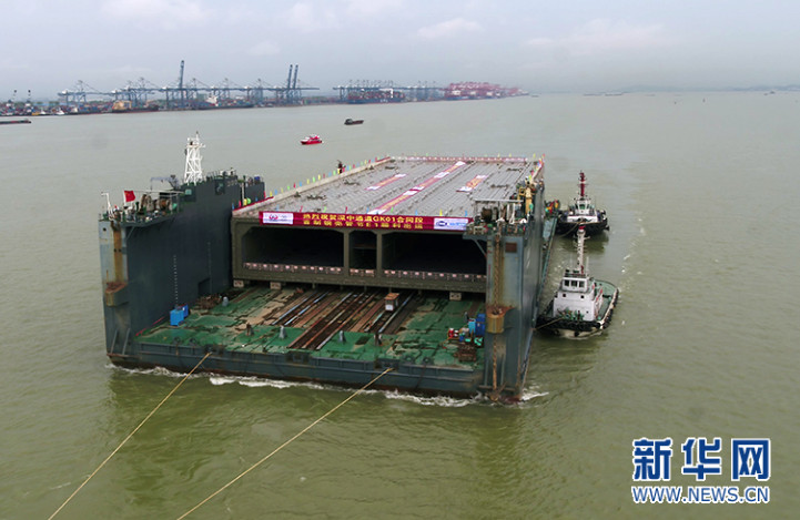 根據《新華社》報導,首節「沉管隧道」的長約123.8米、寬46米、高10.6米、重達8716噸,在52台移船小車的運載下,穩穩地被搬進了停靠在碼頭邊上的船上。而這台運載著巨無霸鋼殼的船,於26日上午離開廣船國際南沙龍穴製造基地的港池碼頭。