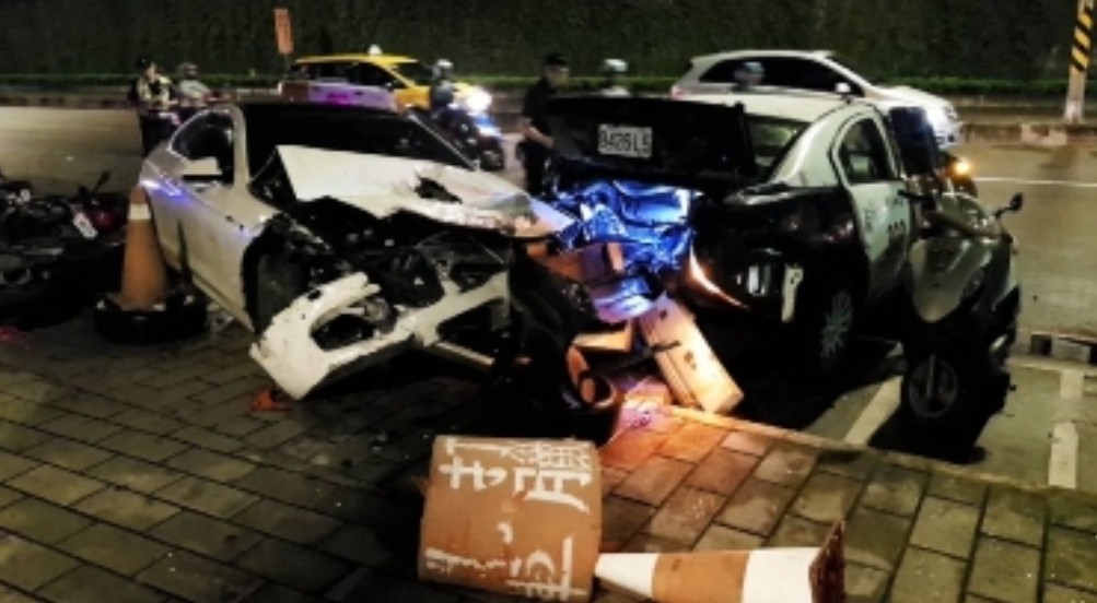 永和警方26日晚間11時許,接獲通報在環河東路有民眾糾紛,到場時員警將警車雙黃燈開啟臨停在路邊,準備回到車上時,好好一輛警車竟被撞到車尾掀起,肇事的白色BMW更是車頭全毀,眾人當場傻眼。所幸員警並無受傷,肇事的鄧姓駕駛則是頸部扭傷,胸、腹部擦傷。