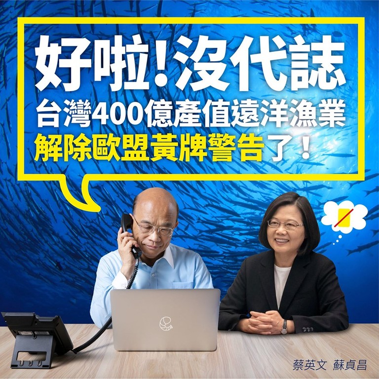 針對遠洋漁業解除黃牌警告,蘇貞昌表示,經過國人同胞支持,政府、漁民多年努力,歐盟解除台灣遠洋漁業黃牌的管制,這涉及到400億的漁產利益,真的是很大的突破,繼3月台灣努力已經被歐盟解除稅務不合作名單後,又一個好成績,希望大家繼續努力,讓我們台灣一步一步走出更好的成績。