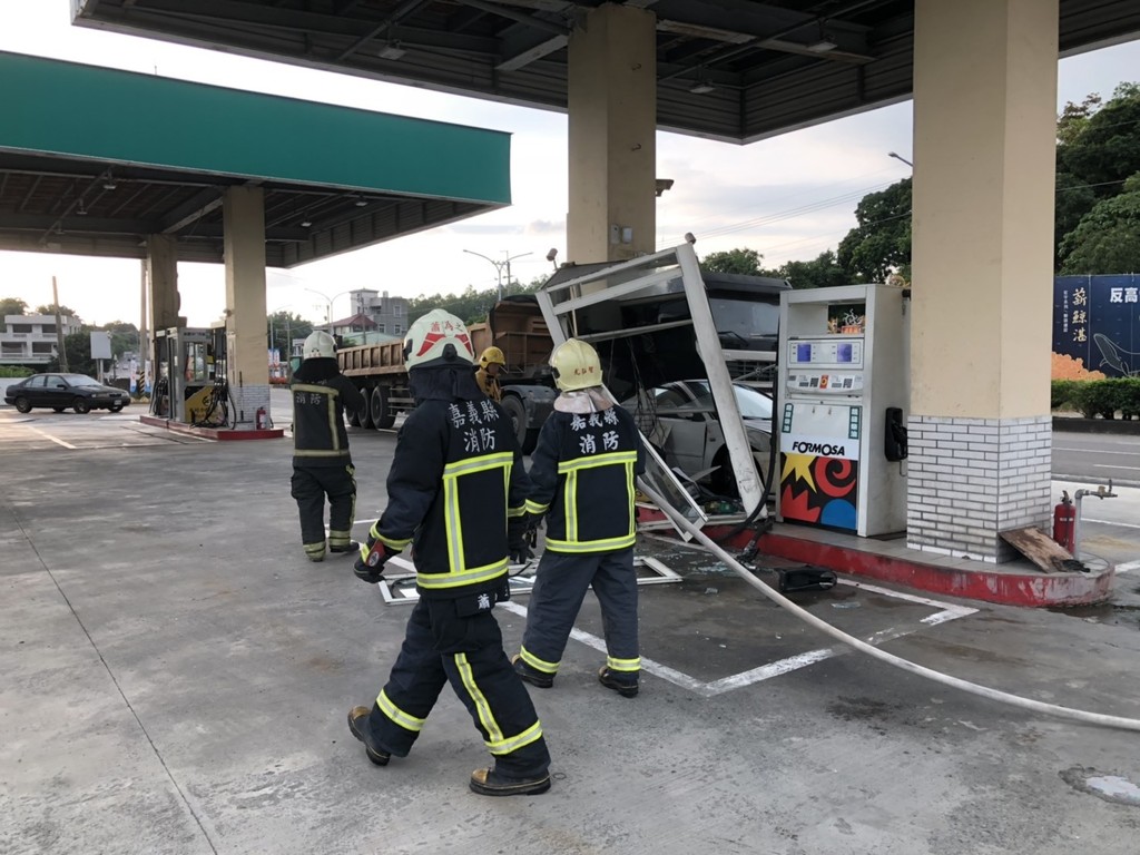 嘉義縣消防局接獲民眾通報,嘉義縣民雄鄉建國路上一加油站遭民眾駕駛自小客車直接撞上加油機台,所幸站內值班人員見狀快速閃避,無人傷亡,但加油站內加油島上整座月台卻被撞得支離破碎,詳細肇事原因正由警方調查釐清中。