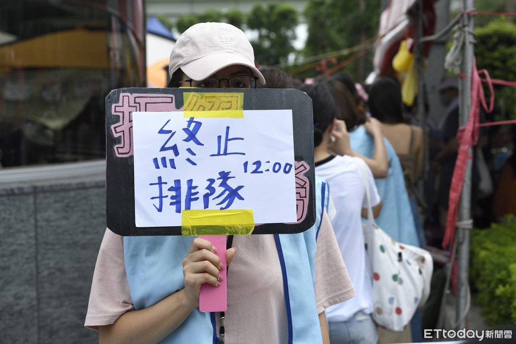 ▲長榮空服員工會針對是否繼續罷工的投票於6/29 中午12:00停止排隊,工會成員拿出停止投票的牌子。(圖/記者湯興漢攝)