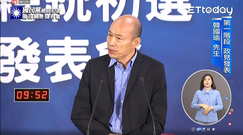 國民黨總統初選國政願景電視發表會第二場今(29)日下午在台中舉行,第一階段為12分鐘的個人政見發表,高雄市長韓國瑜上台後發揮口若懸河本領,全程幾乎不看稿,時間把握相當精準,在剩1秒時完美結束。不過觀看直播的《ETtoday新聞雲》和PTT網友多給負評,認為根本沒講到實際的點,「完全沒政見」。