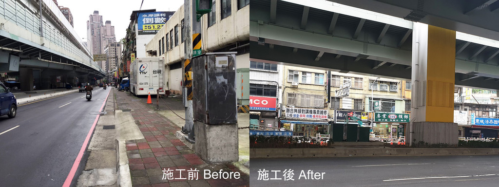 此次更新改善工程包含人行道拓寬,以及將電箱由人行道移至中央分隔島,更傾聽民眾的需求規劃機車停車格與卸貨區,也為汽機車和行動不便之人士設置相關斜坡道。透過此更新工程,人行道的使用功能相對提升,整體市容也更為美觀。