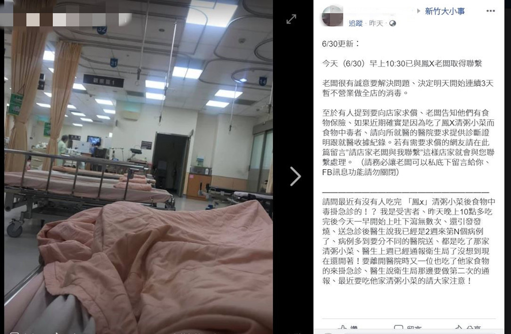 新竹一名網友於30日晚間吃完某間清粥小菜的餐點後開始上吐下瀉,網友緊急掛急診並上網詢問是否有其他人同樣遇到這樣的情形。網友po文「請問最近有沒有人吃完鳳x清粥小菜後食物中毒掛急診的!?」原po表示,吃完清粥小菜後開始上吐下瀉還發燒,急診醫生說他已經是2週來第N個病例了,由於食物中毒的病例很多因此除了分送其他醫院外,醫生也先通報衛生局。原po還說,當自己看完醫生領完藥準備離開時,竟然後面還有同樣吃了那家清粥小菜藥去掛急診的客人。