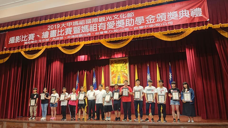 2019年大甲媽祖國際觀光文化節「攝影比賽」、「繪畫比賽」和「媽祖有愛獎助學金」的結果出爐,昨天舉行頒獎,董事長顏清標和副董事長鄭銘坤都出席頒發獎狀、獎金給得獎學生。