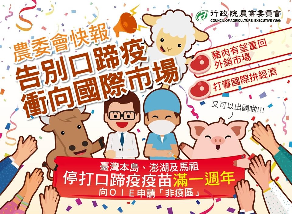 口蹄疫拔針1日屆滿1周年,立法院長蘇嘉全表示,1997年口蹄疫從中國大陸傳入台灣,導致台灣豬隻與豬肉價格雙雙暴跌腰斬,全國一年內減少五千戶豬農,經過政府、豬農22年來的合作努力,終於消滅疫病,取得申請口蹄疫不施打疫苗非疫區的門票,這代表台灣豬肉有望重回外銷市場,打響國際拚經濟。