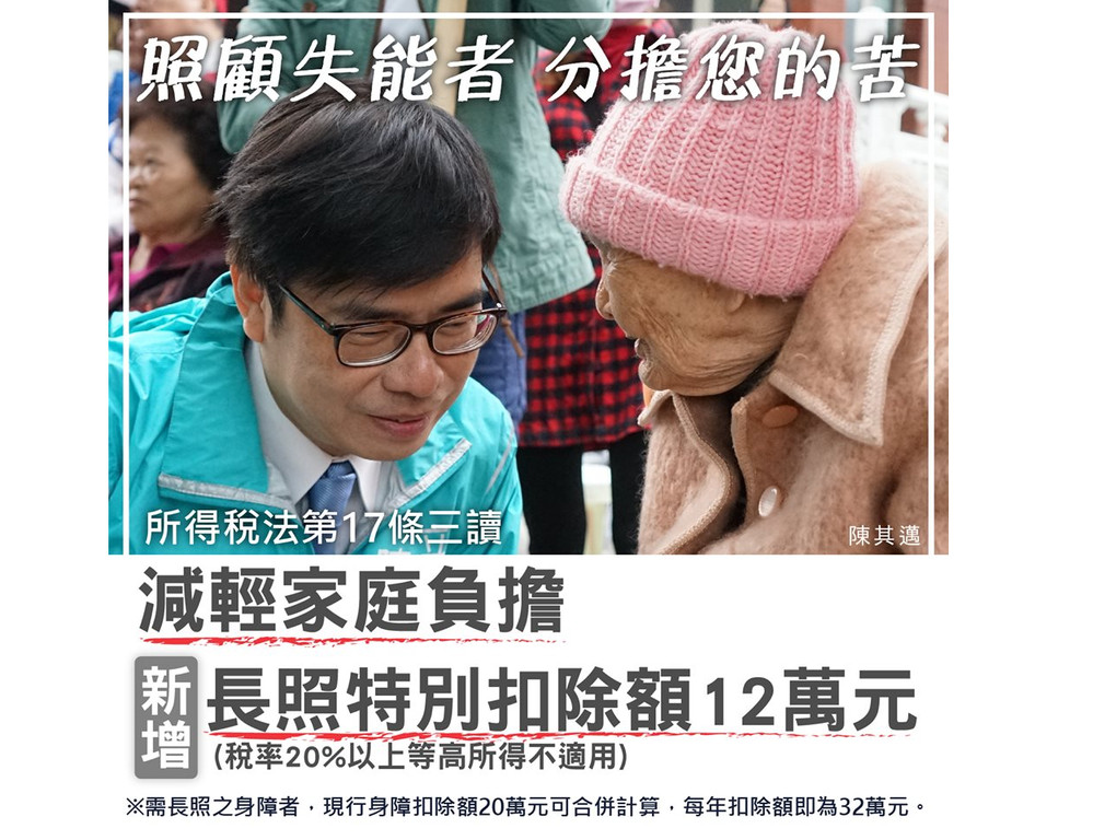 陳其邁2日在臉書表示,今年4月行政院提出的新增長照扣除額,每人每年最高12萬的所得稅法第17條修正案,已經三讀通過,且將回溯自今年1月1日開始計算,明年報稅可抵扣,今年已經有感減稅,但明年報稅,照顧失能者的家庭,負擔可以更減輕一些。