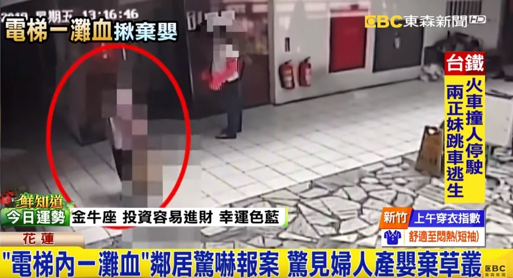 與陳女同住一棟大樓、目擊當下情況的鄰居指出,當時電梯降到1樓後,門一打開就見到陳女臉色蒼白,且雙腿間還不斷流下鮮血,電梯地板也被濺得鮮紅,仔細一看,赫見裙擺中央掛著一條臍帶,「我看著她走出來,地上全是血跡,她還跟我求救,說『姊姊,救我!』」