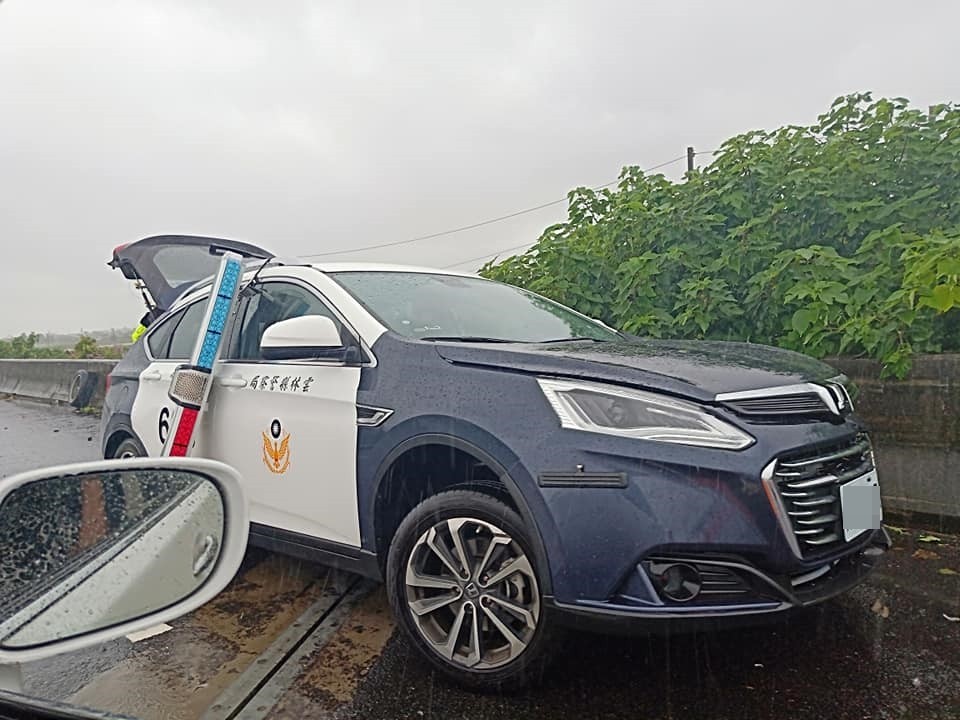 雲林縣3日一早雨勢不斷,台78線在上午7時、9時、9時30分,分別在6.5K、10.4K、20K處接連發生3起打滑自撞車禍,其中還有警車不敵強降雨,失控打滑猛力撞上護欄,連車頂的警笛都脫落,只能狼狽地懸掛在車側。