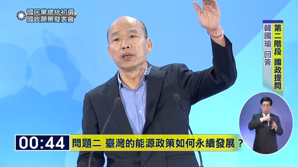 國民黨總統初選廝殺激烈,由黨中央舉辦的最後一場「國政願景電視發表會」3日晚間在台北登場,主題為經濟、財政、能源與環境。國民黨初選參選人韓國瑜在第二輪答題時表示,若他上任後將重啟核四,四大配套措施包括以核養綠、智慧型電網、平衡區域電力、促進電力市場正常化。