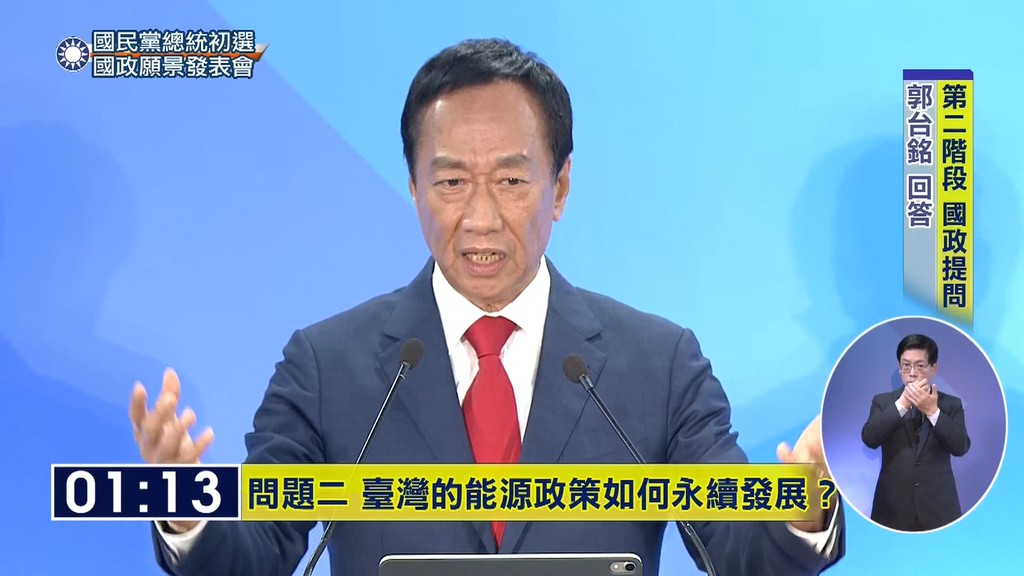 「國政願景電視發表會」第二輪由主持人現場抽題進行提問,第一個抽中的題目為「能源題」,內容為蔡英文總統就任以來,採取躁進的「非核家園」政策,藐視「以核養綠」公投結果。如果您當選中華民國總統,請問台灣的能源政策如何才能永續發展?