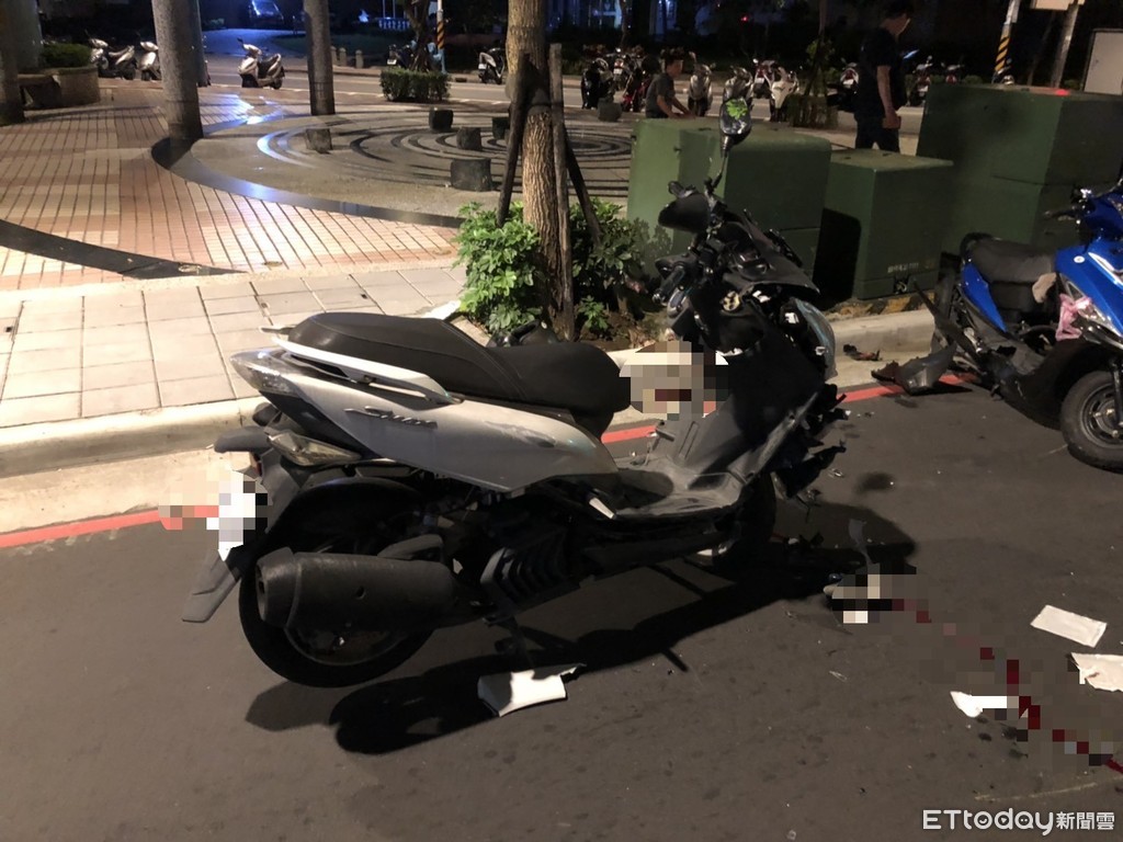 ▲▼兩輛機車相撞後,車殼碎裂一地,白色機車車頭也嚴重毀損。(圖/記者趙永博攝)