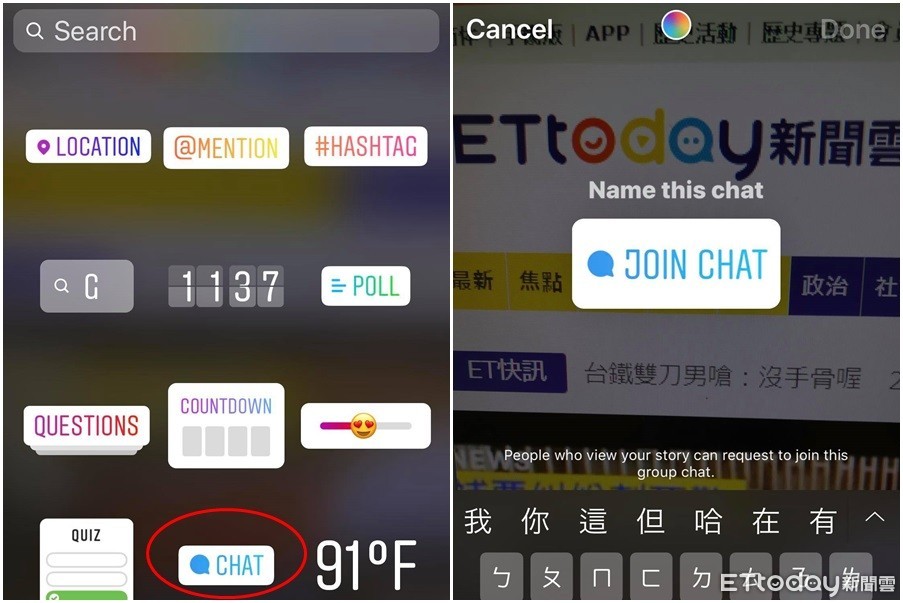 把Instagram更新至最新版,就可以發現限時動態上已經能添加「聊天」的貼紙,接著輸入聊天室名字,可以針對不同的主題放上照片,例如討論運動賽事,藝人八卦,或是一般職場的討論和內容。
