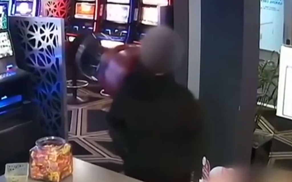 綜合外媒報導,從警方公布監視器畫面來看,一名蒙面的男子手持一把手臂長的大刀,走進美人魚海灘飯店酒吧的遊戲廳,威脅站在櫃台外的女店員交出錢財。只見女店員急忙跑進櫃台內,慌張地地用鑰匙打開收銀台,把現金全部拿給該名搶匪。